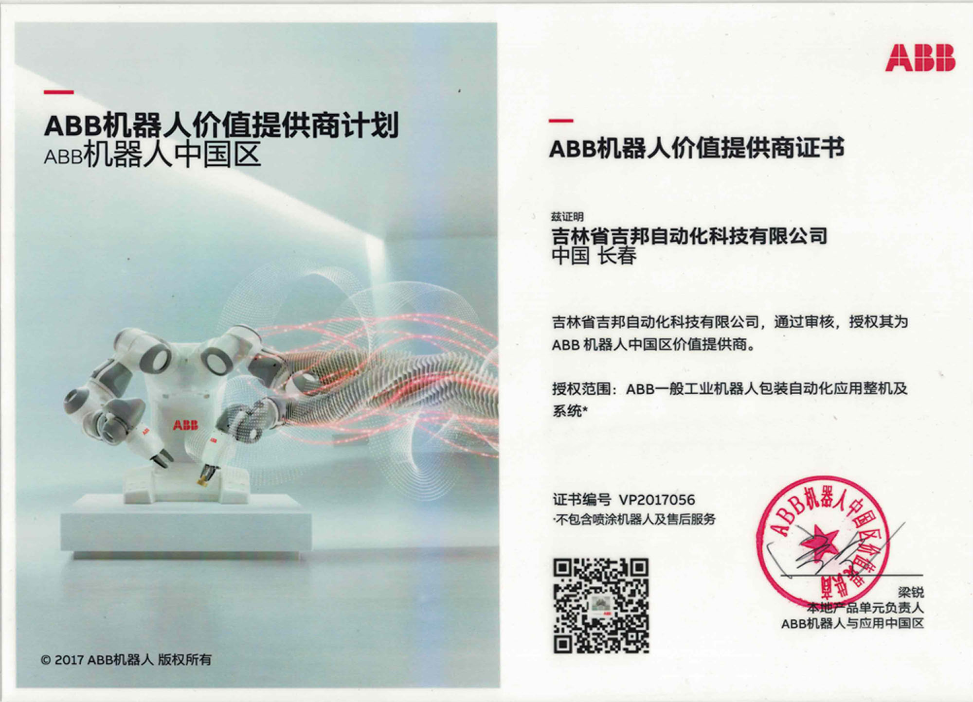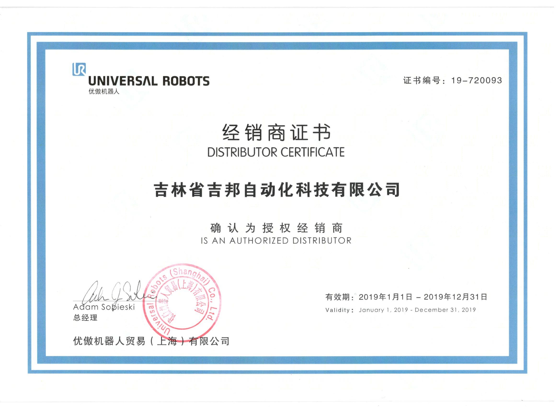 UR機(jī)器人經(jīng)銷(xiāo)商證書(shū)